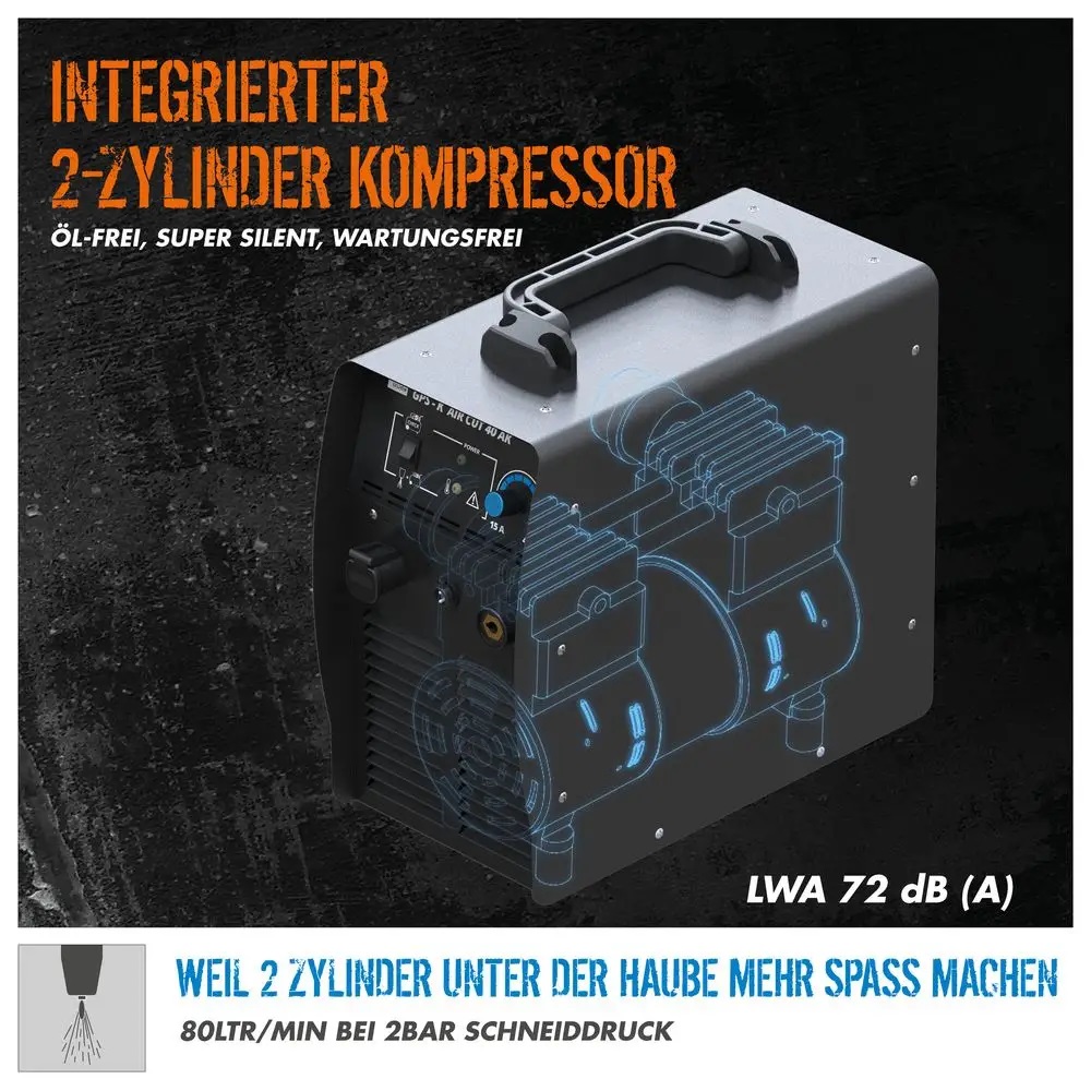 Συνδυάζει την μηχανή κοπής πλάσμα και τον συμπιεστή σε ένα και επομένως μπορεί να χρησιμοποιηθεί τόσο στατικά στο εργαστήριο όσο και κινητά κατά τη συναρμολόγηση. Με μέγιστο ρεύμα κοπής έως 40A, το GPS-KA HAirCut 40Ak είναι σε θέση να κόψει όλα τα μεταλλικά υλικά πάχους έως 12 mm στην κοπή διαχωρισμού και έως 6 mm στην κοπή ακριβείας. Η τεχνολογία αιχμής inverter και τα εξαρτήματα όπως τα IGBT επιτρέπουν έναν συμπαγή σχεδιασμό, καθώς και μια συχνότητα λειτουργίας έως 40.000HZ και κατά συνέπεια έναν σημαντικά υψηλότερο κύκλο λειτουργίας από τις συμβατικές συσκευές μετασχηματισμού. Το συμπεριλαμβανόμενο φλόγιστρο και το καλώδιο φλόγιστρου 2,5 μέτρων παρέχουν μέγιστη ευελιξία καθώς και καθαρή κοπή ακριβείας. Με ενσωματωμένη ασφάλεια ανάφλεξης, συσκευή μείωσης κινδύνου (HRD) και καινοτόμο ασφάλεια ενεργοποίησης στο φλόγιστρο, ο χρήστης προστατεύεται επιτέλους με τον βέλτιστο τρόπο.